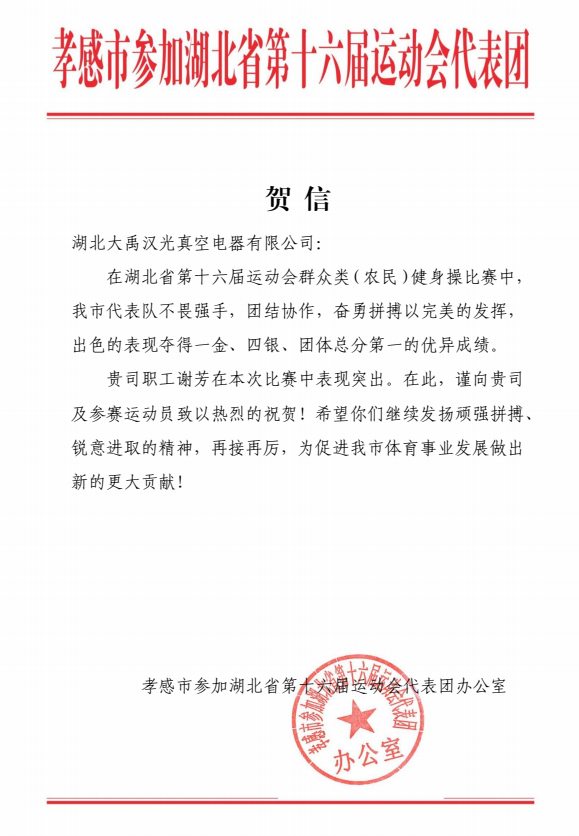下圖為湖北省第十六屆運動會代表團辦公室發來的感謝信!